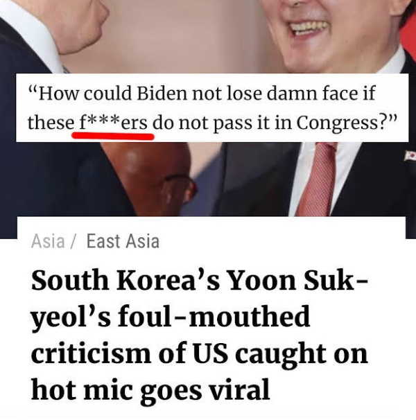 사우스 차이나 모닝 포스트는 "미국을 향한 대한민국 윤석열의 입버릇이 상스러운 발언이 카메라에 잡힌 뒤 퍼지고 있다(South Korea's Yoon Suk-Yeol's foul-mouthed criticism of US caught on hot mic goes viral)"고 보도했는데요.