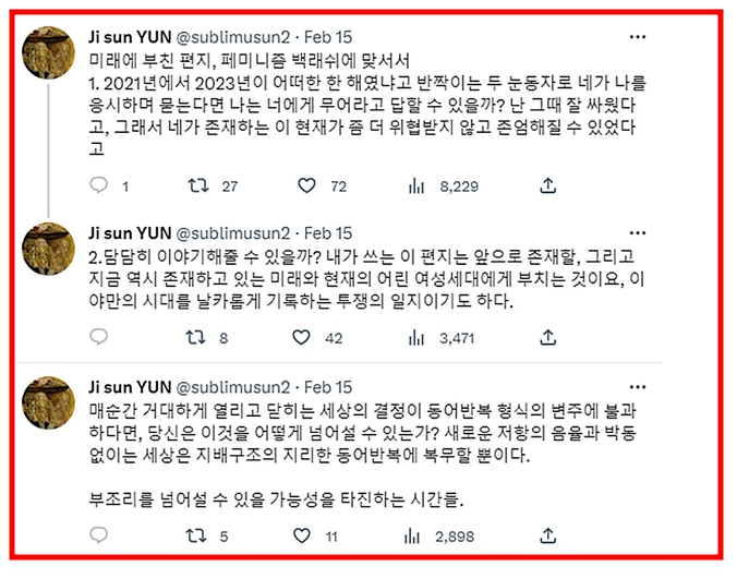 윤지선 교수는 "미래에 부친 편지, 페미니즘 백래쉬에 맞서서. 1. 2021년에서 2023년이 어떠한 한 해였냐고 반짝이는 두 눈동자로 네가 나를용시하며 문는다면 나는 너에게 무어라고 답할 수 있을까? 난 그때 잘 싸웠다고, 그래서 네가 존재하는 이 현재가 좀 더 위협받지 않고 존엄해질 수 있었다고"라며 말했습니다.